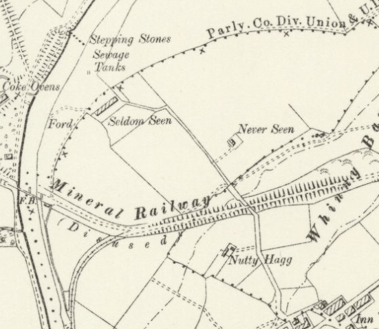 So began an adventure. What was a blank on a current map turned out to be a large inhospitable marshland, well overgrown. I took the path from Newfield to Willington, passing the remains of ‘Nutty Hag’ farm, and paused to look for ‘Never Seen’ farm remains, but they were not to be seen. After some searching I finally came across the remains of Seldom Scene, hidden and overgrown by hawthorn bushes and brambles. From his work among, at the time 600 men and boys, William and James must have returned to this quiet hidden place each day.