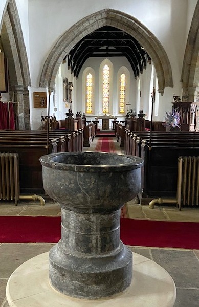 Of course I don’t remember the baptism. But today I did ‘re-member’ it. Firstly, by visiting the place. My baptism took place in the beautiful 12th century parish church of St Michael, Bishop Middleham in County Durham. I revisited the church today, the anniversary day. St Michael’s was the parish church of many of my ancestors, and great great grandparents lie in the churchyard. My grandmother’s funeral took place here. And there is the 13th century font of Frosterley marble in which I was baptiosed. For over 250 years members of my family lived in this small parish, no doubt many ancestors were also baptised in the same font.