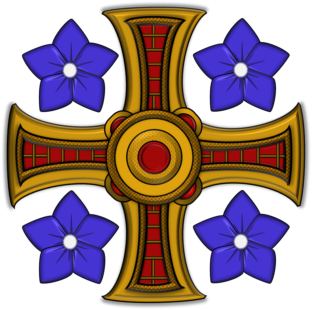 Badge: A Cross of St Cuthbert Or cantoned by four Spring Gentian Flowers Azure.
