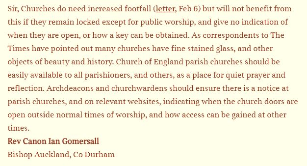 Today I was delighted that The Times published a letter to the Editor from me (above) on this topic. It is my hope that parish churches and their churchwardens, and archdeacons sharing in oversight, will relaise the calling of church buildings to serve people by simply havcing open doors ourtside the times of Sunday worship.