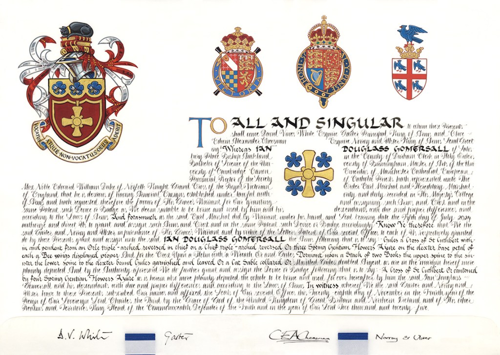 The letters are prepared on vellum, the artist paints the coats of arms on the document and an appointed ‘scrivener’ writes, in calligraphic script the formal grant. The signatures and official seals of Garter King of Arms andf Norroy and Ulster King of Arms are attached.